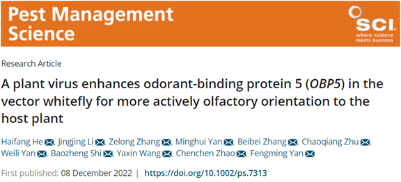 闫凤鸣教授团队在国际学术期刊Pest Management Science在线发表了题为“A plant virus enhances odorant-binding protein 5 (OBP5) in the vector whitefly for more actively olfactory orientation to the host plant”的研究论文。该研究以重要入侵害虫烟粉虱(Bemisia tabaci)及其半持久特异传播的瓜类褪绿黄化病毒(Cucurbit chlorotic yellows virus, CCYV)为研究对象,揭示了CCYV对介体昆虫烟粉虱嗅觉系统的调控机理。