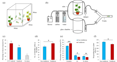 越来越多的研究结果显示,携带植物病毒的介体昆虫的感觉和行为均有很大的不同,植物病毒可以通过直接(修饰介体昆虫的感觉和行为)和间接(改变植物外观、次生物质、营养、防御等)的方式改变介体的适合度和对寄主植物的适应性。本研究通过行为选择实验发现,感染CCYV的烟粉虱对寄主植物黄瓜具有更高的嗅觉灵敏性,具体表现为对黄瓜植株的选择比例增加以及反应时间的减少(图1)。
