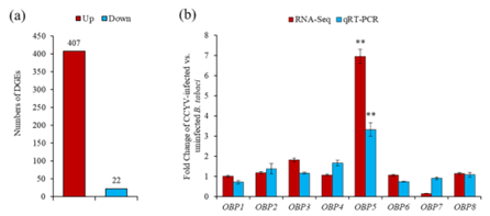 作者利用转录组学技术筛选烟粉虱嗅觉相关基因的变化,结果表明,感染CCYV后烟粉虱气味结合蛋白基因OBP5表达量显著提高。荧光定量qRT-PCR结果与其基本一致。说明CCYV的侵染对烟粉虱的嗅觉系统产生了影响(图2)。