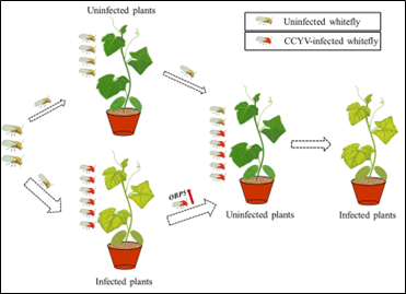 上述结果表明,CCYV可以调控烟粉虱的嗅觉系统。感染CCYV会提高烟粉虱气味结合蛋白OBP5基因的表达,从而增强烟粉虱的嗅觉灵敏性,导致烟粉虱具有更强的寄主定位能力,从而加速病毒在植物种群间的传播(图5)。