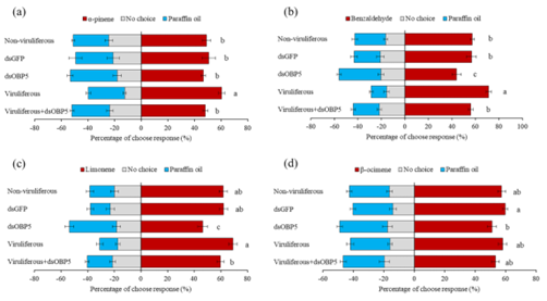 Figure 4. The behavioral response of non-viruliferous, dsGFP, dsOBP5, viruliferous and viruliferous + dsOBP5 strains of B. tabaci to synthetic compounds.