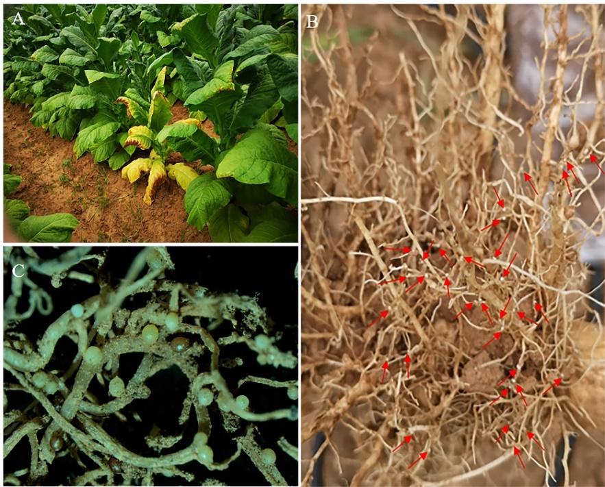 烟草作为我国重要的经济作物,是国家和地方财政收入的重要来源。烟草孢囊线虫病是烟草重要的土传病害之一。在美国,烟草孢囊线虫病可使烟区平均减产15%,甚至绝收。近年来,崔江宽副教授团队系统调查了危害河南烟区烟草植物病原线虫的种类。2018-2022年,在平顶山等地,发现烟草有一种孢囊线虫危害。根部新形成的白雌虫最高可达200多个,烟草地上植株出现明显焦枯、发黄、矮小。据悉,植物线虫病害可诱发多种真菌和细菌性土传病害,严重威胁着烟草的健康生长。因此,明确该线虫种类对保障河南烟区和我国烟草的安全生产意义重大。