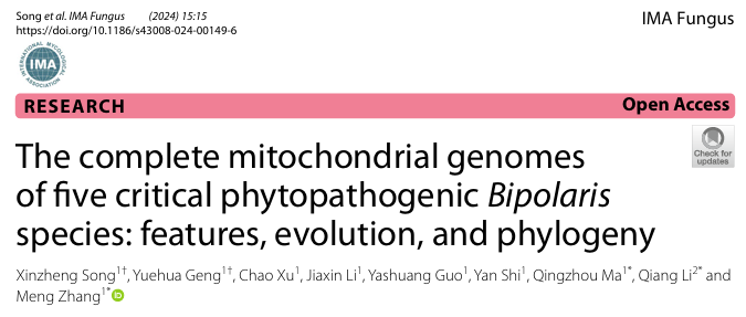 张猛教授课题组在中国科学院一区国际真菌学协会旗舰期刊《IMA Fungus》杂志(IF 5.4)在线发表了题为“The complete mitochondrial genomes of five critical phytopathogenic Bipolaris species: features, evolution, and phylogeny”的研究论文。