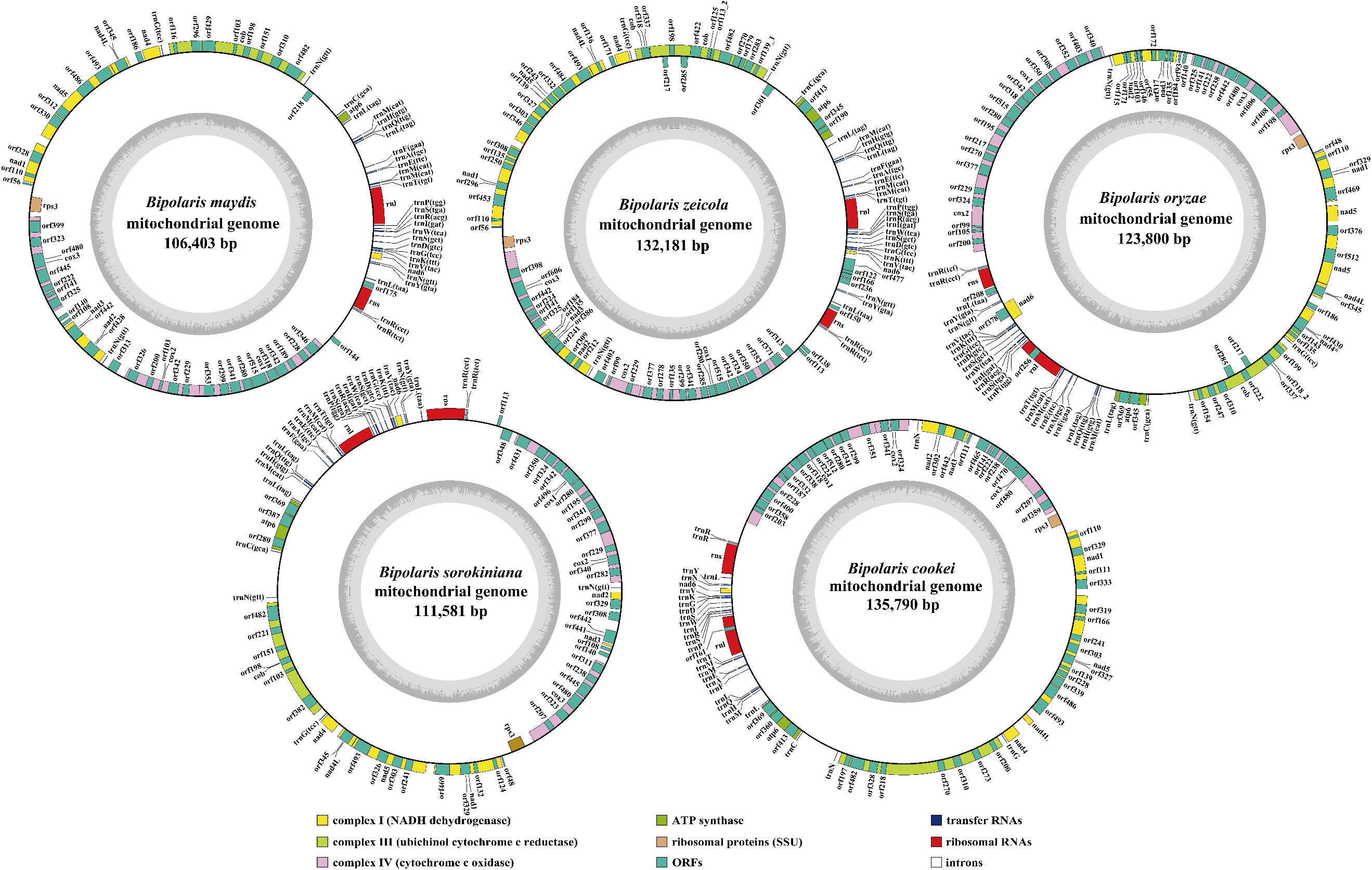 图 五个Bipolaris属物种的线粒体基因组结构图