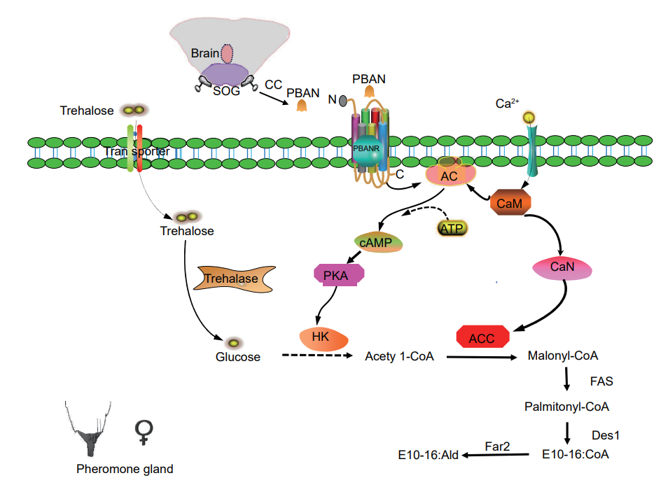 桃蛀螟是一种危害农作物和水果的重要害虫,给农业及水果生产造成了严重的损失。该害虫依赖其性信息素来吸引异性,确保交配的正常进行及随后繁殖的成功。然而,该害虫性信息素生物合成的分子机制仍不清楚。本研究通过对蛀螟信息素腺体(PGs)进行转录组测序后,确定目标基因,研究了PBAN调控性信息生物合成详细机制。结果显示,雌蛾交配从第一个暗周期开始,在第二第五个暗周期达到交配高峰,这与性信息素的释放节律一致。通过RNA干扰、药理抑剂和行为测定发现,PBAN利用Ca2+和cAMP作为第二信使来调控性信息素的生物合成。进一步研究发现,PBAN/Ca2+信号能够激活钙调磷酸酶(CaN)和乙酰辅酶A羧化酶(ACC)的活性,且通过RNAi介导的CaN和ACC转录水平的下降显著减少了性信息素的生物合成,最终显著降低了雌蛾引诱雄蛾的能力。重要的是,己糖激酶(HK)被发现响应PBAN/cAMP/PKA信号通路来调控性信息素生物合成。此外,Far2和Des1也被证实参与了PBAN调控的性信息素生物合成。总之,该研究表明,PBAN通过PBANR/Ca2+/CaN/ACC和PBANR/cAMP/PKA/HK通路来调控桃蛀螟性信息素生物的生物合成,这丰富了对蛾类性信息素生物合成细节的理解。
