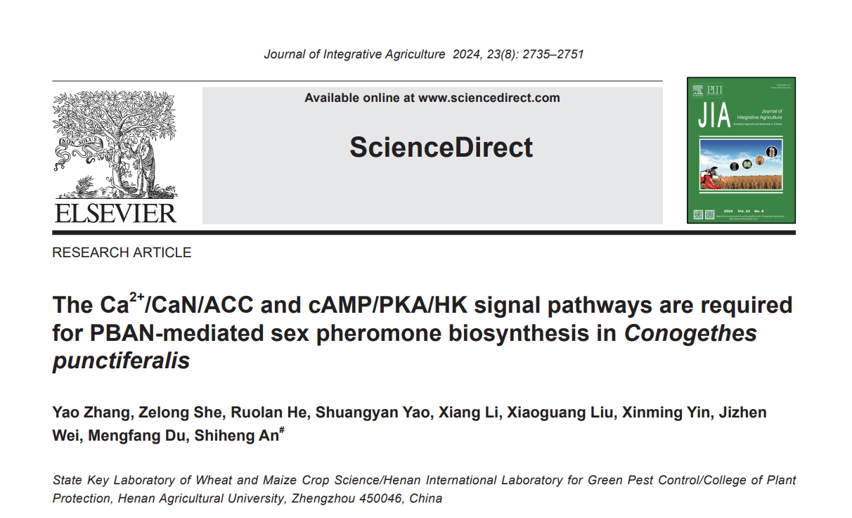 安世恒教授课题组在中国科学院一区TOP期刊《 Journal of Integrative Agriculture》杂志在线发表了题为“The CaN/ACC and cAMP/PKA/HK signal pathways are required for PBAN-mediated sex pheromone biosynthesis in Conogethes punctiferalis”的研究论文。研究揭示了PBAN调控桃蛀螟性信息素生物合成的信号转导机制。