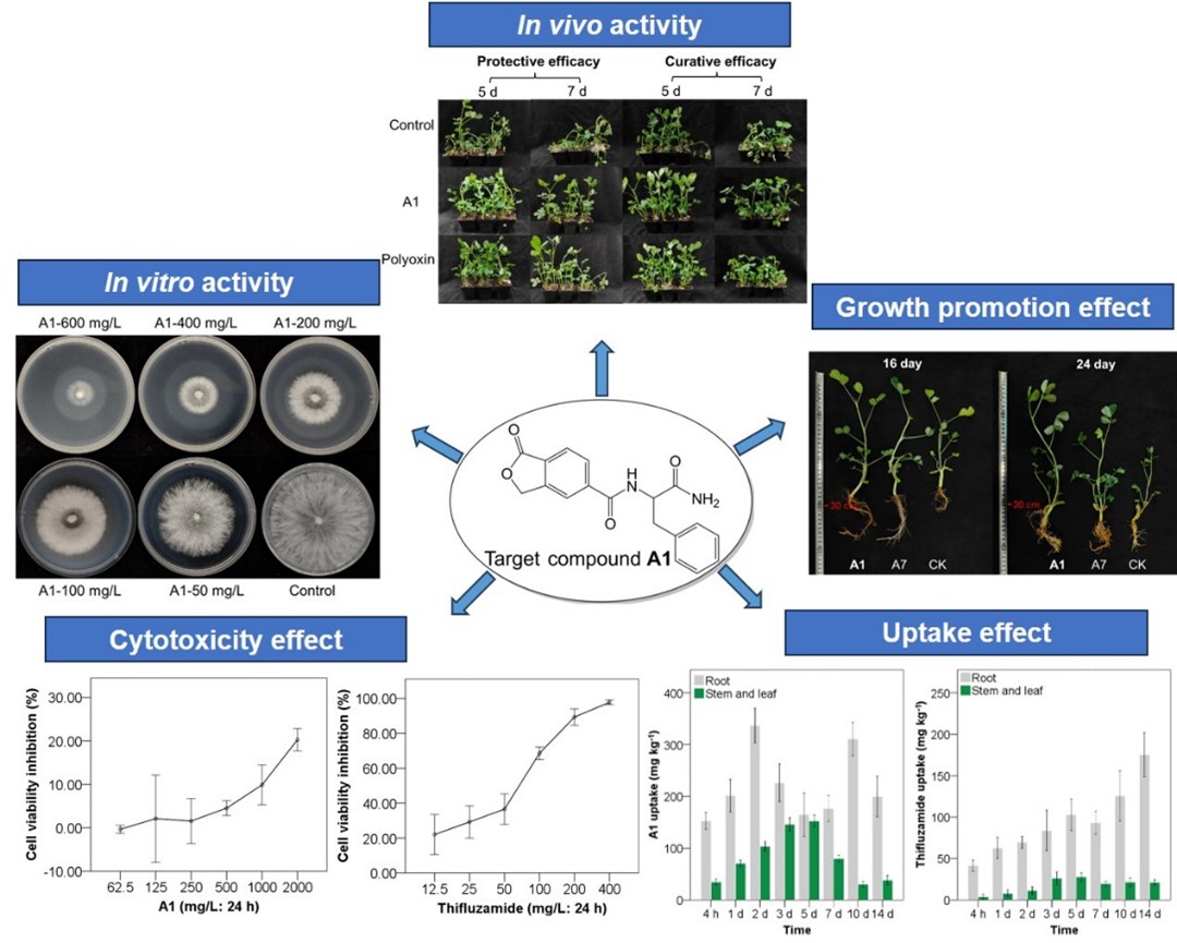 生物活性测试发现,部分目标化合物不仅对齐整小核菌具有良好的离体和活体抑菌活性,还对茄腐镰刀菌(Haematonectria haematococca)、尖孢镰刀菌(Fusarium oxysporum)和层出镰刀菌(Fusarium proliferatum)表现出一定的抑菌活性。特别是化合物A1在离体和活体抑菌活性方面表现优异,并且具有较好的促进植物生长和内吸传导活性。肝细胞毒理实验表明,A1对人正常肝细胞LO2的毒性较低,因此作为一种潜在的绿色杀菌剂先导,值得进一步深入研究。