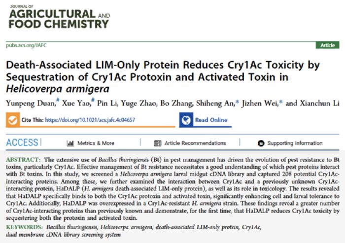 安世恒教授课题组在中国科学院一区TOP期刊《Journal of Agricultural and Food Chemistry》杂志在线发表了题为“Death-associated LIM-only protein reduces Cry1Ac toxicity by sequestration of Cry1Ac protoxin and activated toxin in Helicoverpa armigera”的研究论文。研究发现了更多的与Cry1Ac结合的蛋白,并首次证明HaDALP通过结合Cry1Ac隔离原蛋白和活化毒素来降低Cry1Ac的毒性。