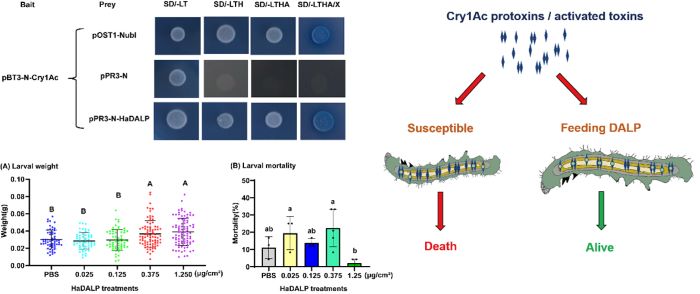 苏云金芽孢杆菌(Bt)在害虫管理中广泛使用推动了害虫对Bt毒素,特别是Cry1Ac的抗性进化。为了有效管理Bt抗性,需要深入了解哪些害虫蛋白与Bt毒素相互作用及其在Bt毒素的毒性和抗性中的作用。为此,我们使用DUAL膜cDNA文库筛选系统对棉铃虫幼虫中肠cDNA文库进行了筛选,共获得了208种棉铃虫中肠蛋白作为潜在的Cry1Ac相互作用蛋白,包括已知的Cry1Ac受体蛋白,Cry1Ac活化蛋白酶和以前未知的与Cry1Ac发生相互作用的蛋白。进一步研究了以前未知的Cry1Ac相互作用蛋白HaDALP(H.amigera death-associated LIM-only protein)与Cry1Ac的相互作用及其在棉铃虫Cry1Ac毒理学和耐药性中的作用。酵母双杂交和配体印迹实验证实,HaDALP特异性结合Cry1Ac原毒素和活化毒素。在中肠细胞系中异源表达HaDALP及随后使用表达的HaDALP蛋白喂养棉铃虫幼虫显著增强了细胞和幼虫对Cry1Ac的耐受性。RT-qPCR显示HaDALP在棉铃虫Cry1Ac抗性品系中高表达。这些结果不仅首次发现了更多的与Bt毒素的毒理学和抗性有关的幼虫中肠蛋白,而且首次证明了HaDALP通过隔离Cry1Ac原毒素和活化毒素来降低Cry1Ac毒性并促进其抗性。
