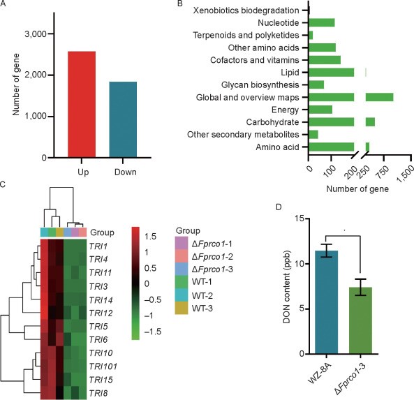 为了进一步明确FpRCO1在假禾谷镰孢中调控基因表达的机理,本研究通过RNA-seq在全基因组水平上鉴定假禾谷镰孢中受FpRCO1调控的基因。与野生型相比,FpRCO1缺失突变体在侵染过程中有2571个基因上调表达和1838个基因下调表达。KEGG通路分析显示,这些DEGs与氨基酸、次级代谢产物、能量、脂质、多酮代谢途径等多种代谢途径高度相关。特别有意思的是,FpRCO1缺失突变体侵染小麦时12个TRI基因表达均下调,同时检测到了ΔFprco1突变体在侵染小麦过程中DON毒素的产量减少。以上研究结果表明,FpRCO1在假禾谷镰孢中通过调控DON毒素的生物合成参与调控病原菌的致病过程。综上所述,该研究通过正向遗传学的方法鉴定假禾谷镰孢致病过程中的关键组分,该团队阐释了Rpd3复合体大小亚基在调控假禾谷镰孢生长发育及致病过程中都发挥了关键作用。