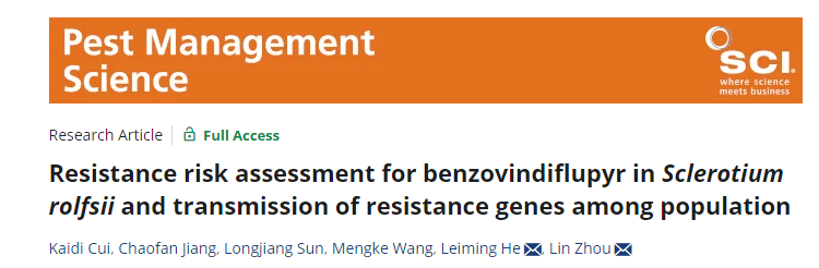 近日,周琳教授团队又在中国科学院一区TOP期刊《Pest Management Science》发表了题为“Resistance risk assessment for benzovindiflupyr in Sclerotium rolfsii and transmission of resistance genes among population”的研究论文。该研究评估了苯并烯氟菌唑对花生白绢病菌的抗性风险和抗性机制,揭示了抗性基因在种群内传播的风险,为苯并烯氟菌唑防治花生白绢病提供了理论指导。