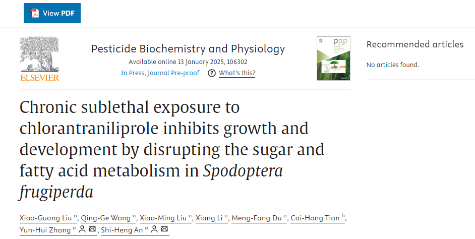 安世恒教授团队在中国科学院一区TOP期刊《Pesticide Biochemistry and Physiology》杂志在线发表了题为“Chronic sublethal exposure to chlorantraniliprole inhibits growth and development by disrupting the sugar and fatty acid metabolism in Spodoptera frugiperda”的研究论文。研究发现,草地贪夜蛾暴露于低剂量(亚致死浓度)氯虫苯甲酰胺不仅显著影响了草地贪夜蛾亲代的生长发育,而且对其后代具有明显不利的跨代影响。
