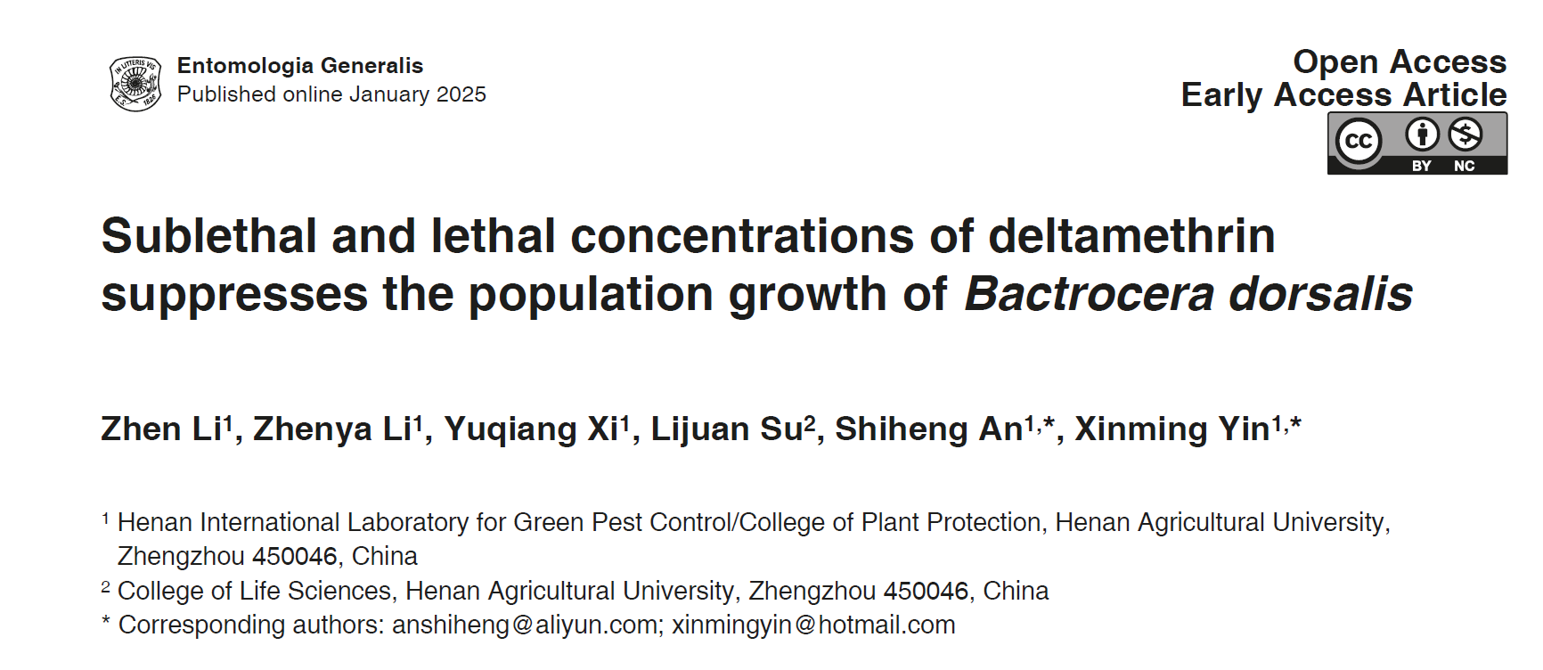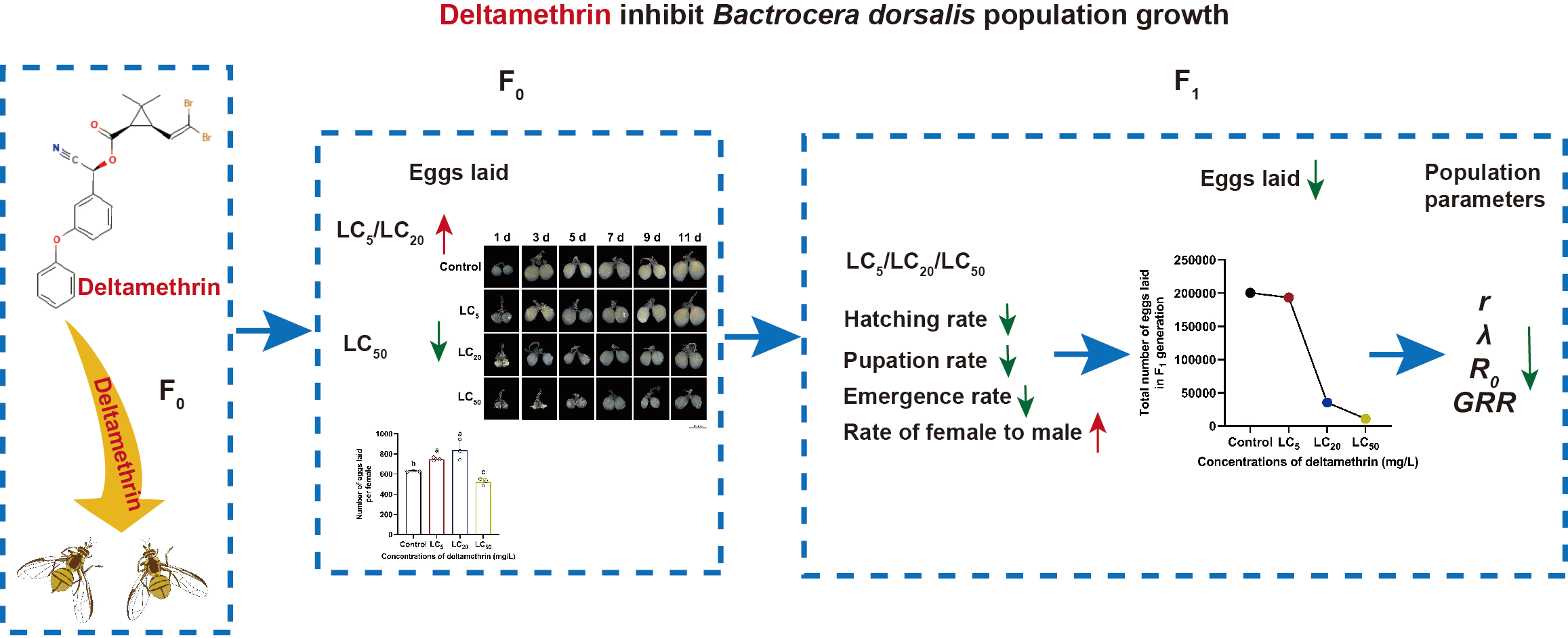 尹新明教授团队/安世恒教授课题组在昆虫学TOP期刊中国科学院一区《Entomologia Generalis》杂志在线发表了题为“Sublethal and lethal concentrations of deltamethrin suppresses the population growth of Bactrocera dorsalis”的研究论文。研究揭示了亚致死和致死浓度的溴氰菊酯抑制桔小实蝇种群发生的机制。