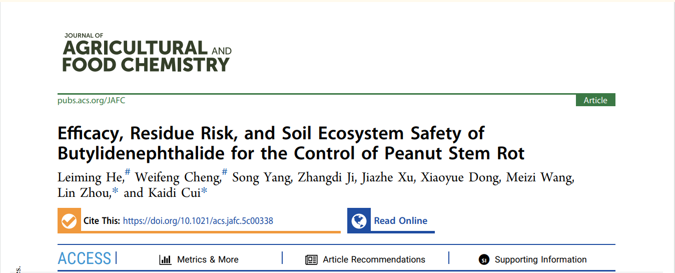 周琳教授团队在中国科学院一区TOP期刊《Journal of Agricultural and Food Chemistry》杂志在线发表了题为“Efffcacy, Residue Risk, and Soil Ecosystem Safety of Butylidenephthalide for the Control of Peanut Stem Rot”的研究论文。该研究明确了植物源农药活性化合物丁烯基苯酞防控花生白绢病的精准高效安全施用技术,并于田间进行了试验示范,为该药剂的开发利用提供了重要依据。