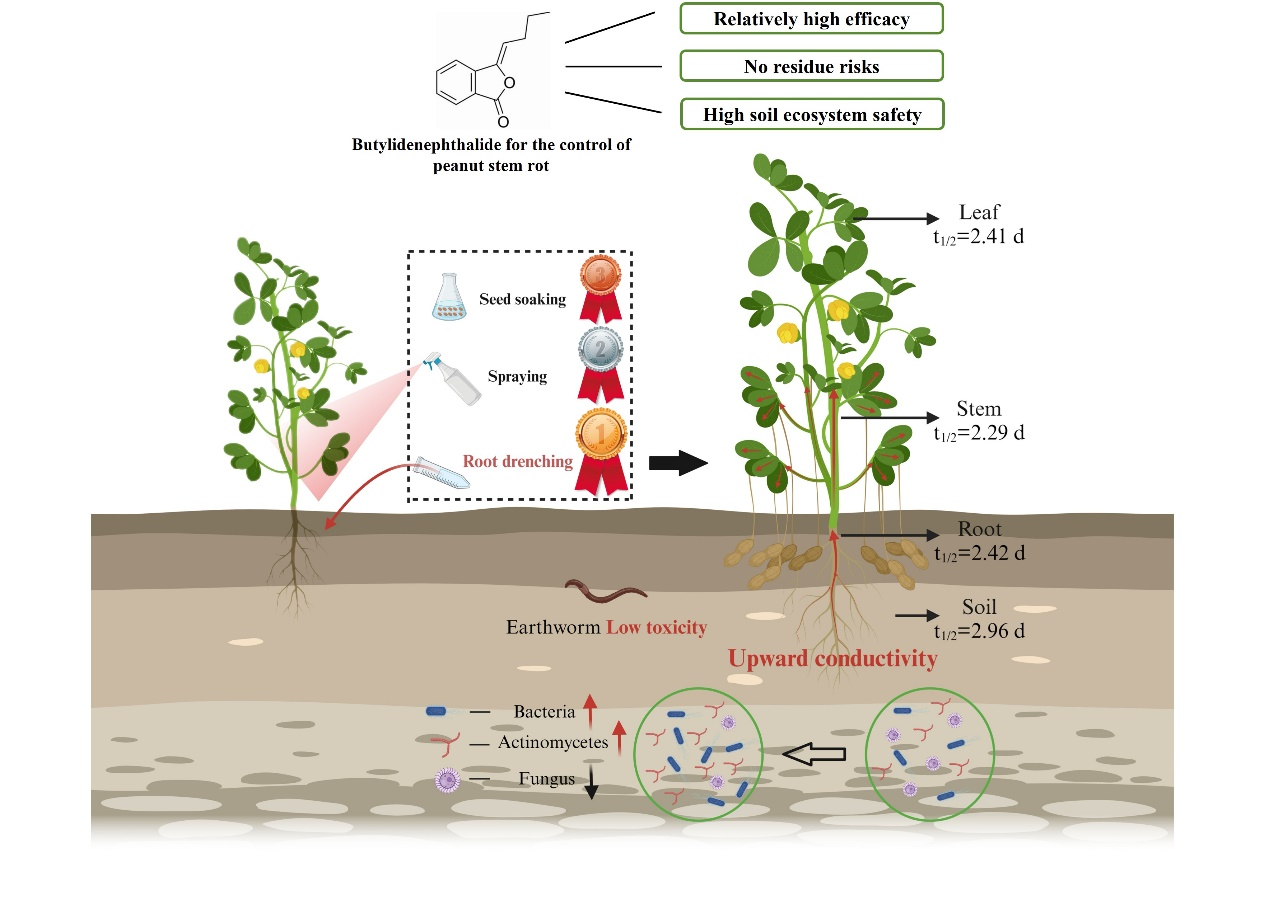 花生白绢病是由齐整小核菌(Sclerotium rolfsii)引起的一种具有破坏性的土传真菌病害。近年来,由于气候条件和种植制度的改变,花生白绢病在我国花生种植区发生日益严重,对花生产量和品质影响很大。课题组前期研究发现,药用植物川穹中的丁烯基苯酞能够显著抑制花生白绢病菌菌丝生长和菌核萌发,表现出良好的生物活性(Cui et al., 2023),已获授权发明专利1件;通过化学结构修饰合成了多个新型氨基酸苯肽类化合物,为创制新农药奠定了物质基础(Wang et al., 2024),已申请相关发明专利1件。为加快推进丁烯基苯酞的开发利用,研究团队进一步研究明确了丁烯基苯酞田间施用方式、使用剂量和频次等关键应用技术,花生收获时荚果和秸秆均未检测到药物残留,无人畜食用风险。丁烯基苯酞在土壤-花生之间表现出很强的吸收、富集能力(RCF/BCF>1),并具有较好根部向上传导性(TFstem+leaf = 0.95)。此外,该药剂对蚯蚓低毒,可提高土壤细菌、放线菌等有益种群丰度并抑制真菌数量。可见,丁烯基苯酞对花生白绢病防治效果好、无残留风险,且对土壤生态系统安全,开发为防治花生白绢病的植物源农药具有较大的应用前景。