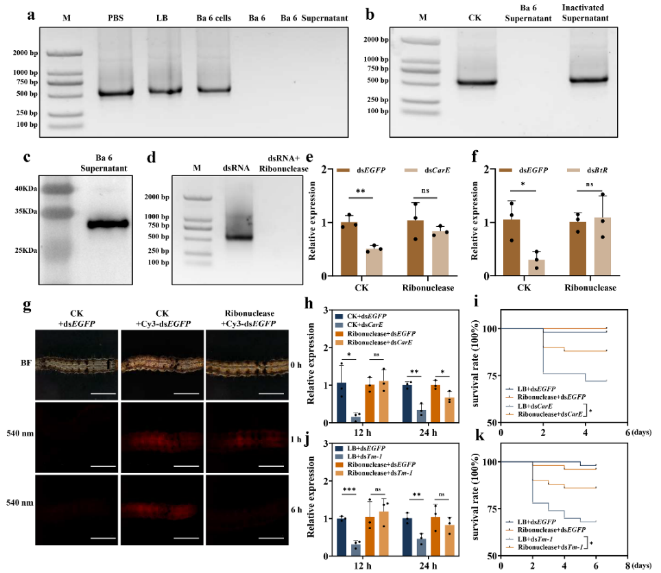 通过一系列实验分析,表达并纯化了Ba 6的效应蛋白—Ribonuclease蛋白,并通过Western blotting实验验证其在菌液上清中的存在。体内实验发现,用菌液/上清液/ Ribonuclease蛋白处理后的棉铃虫,靶基因沉默效率显著降低,死亡率也显著下降。通过荧光实验可直接观察到dsRNA在体内被降解。