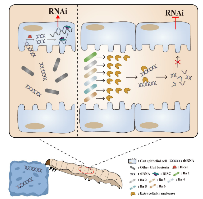 当外源dsRNA进入昆虫体内后,昆虫的共生细菌可以通过分泌核酸酶直接将其降解,阻止dsRNA进入肠道细胞,从而削弱RNAi的效果。