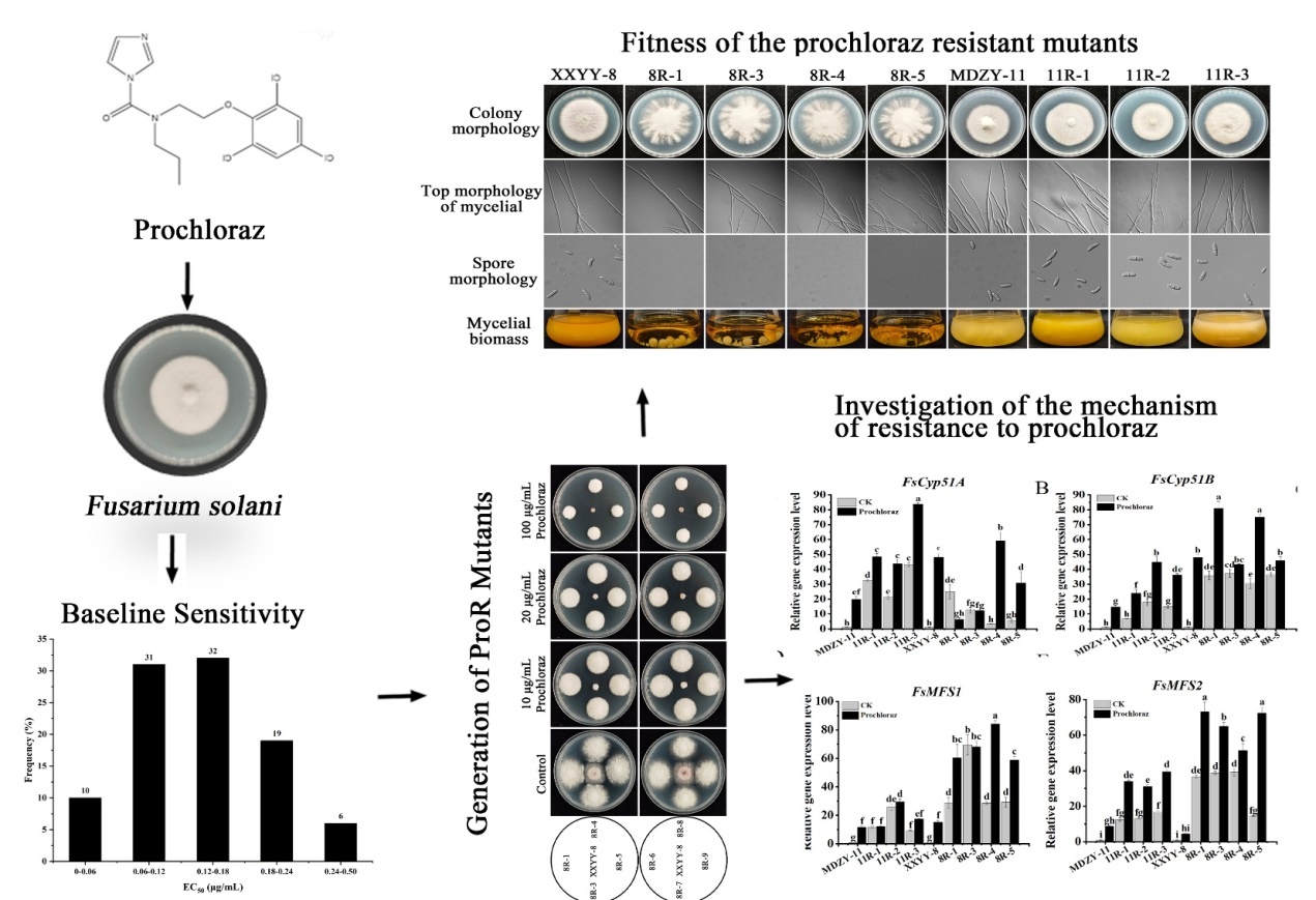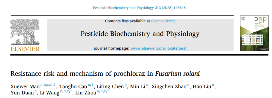 周琳教授团队在中国科学院一区TOP期刊《Pesticide Biochemistry and Physiology》发表了题为“Resistance risk and mechanism of prochloraz in Fusarium solani”的研究论文,研究揭示了花生根腐病菌茄腐镰刀菌(Fusarium solani)对咪鲜胺的抗性风险,明确其抗性主要与靶标基因FsCyp51和MFS超家族转运蛋白FsMfs基因过表达紧密相关。该发现为田间花生根腐病菌的科学防控及抗性治理提供理论依据。