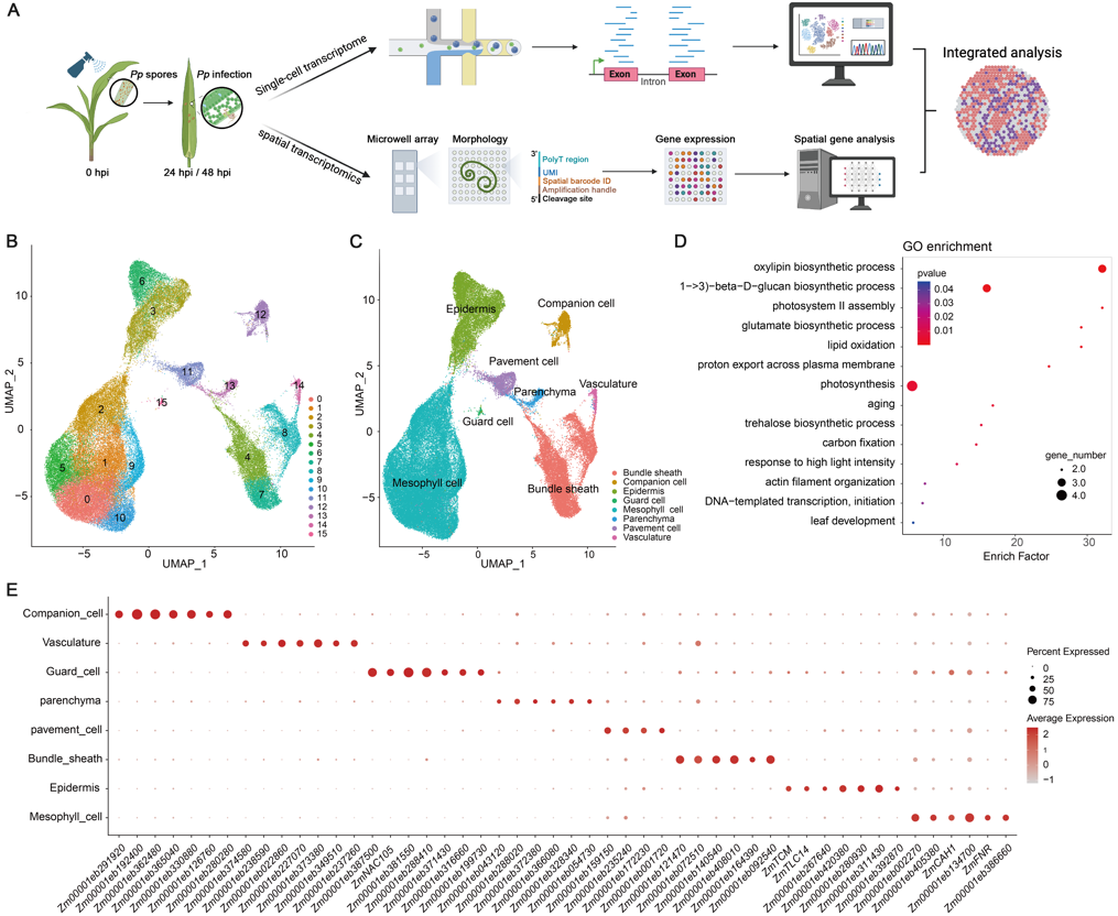 近年来,单细胞转录组和空间转录组技术的突破为植物与病原物互作研究带来了前所未有的精度提升:前者能够在单个细胞水平上解析基因表达,揭示植物应答病原侵染时的细胞异质性;后者则能够绘制基因在组织内的空间表达图谱,追踪特定位置和时间下的转录动态。两者的整合为解析植物免疫的分子机制提供了全新视角,直观地揭示了不同细胞类型和组织区域如何协同应对外界威胁。
