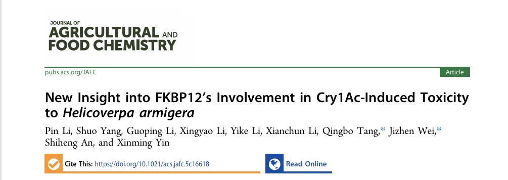 安世恒教授课题组在农林科学TOP期刊中科院一区《Journal of Agricultural and Food Chemistry》杂志在线发表了题为“New insight of FKBP12's involvement in Cry1Ac-induced toxicity to Helicoverpa armigera”的研究论文。该研究从Bt受体分子伴侣调控角度,揭示了FKBP12 通过调节 ABC 转运蛋白 ABCC2 的转运活性参与Cry1Ac 杀虫作用的新机制,为深化 Bt 蛋白作用机理及害虫抗性治理提供了新的理论依据。