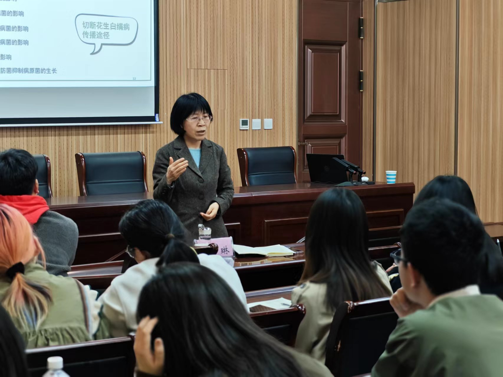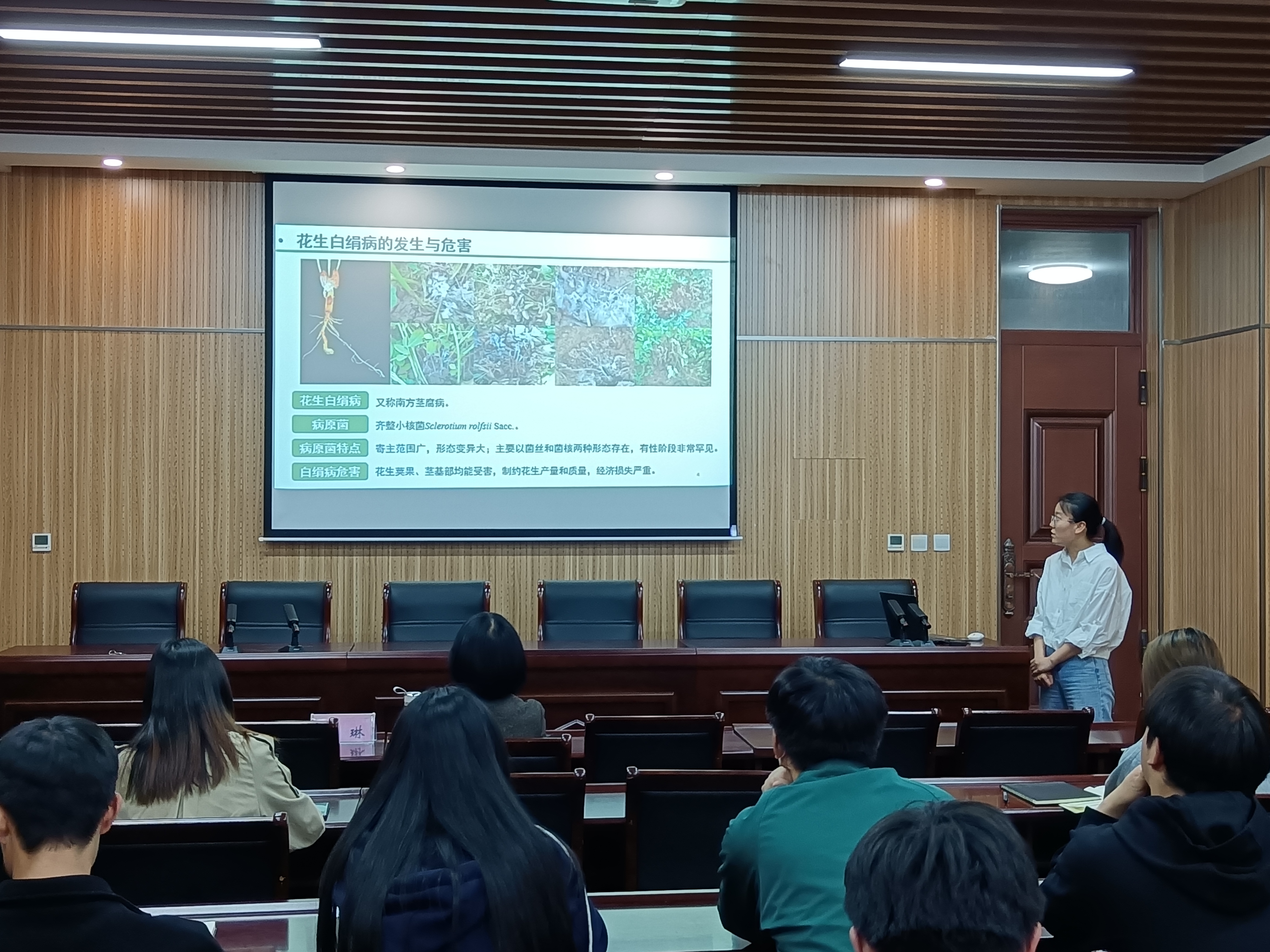 周琳又深入介绍了花生作为河南第二大特色作物,研究花生白绢病灾变机制的重要意义,解释了课题怎样源于生产调查,设计研究思路。以“四个面向”为指导,畅谈了如何科学选题,平衡基础研究和应用研究之间的关系,强调科研中基础理论研究和生产应用需求的矛盾,深入阐述两者之间的互促关系。