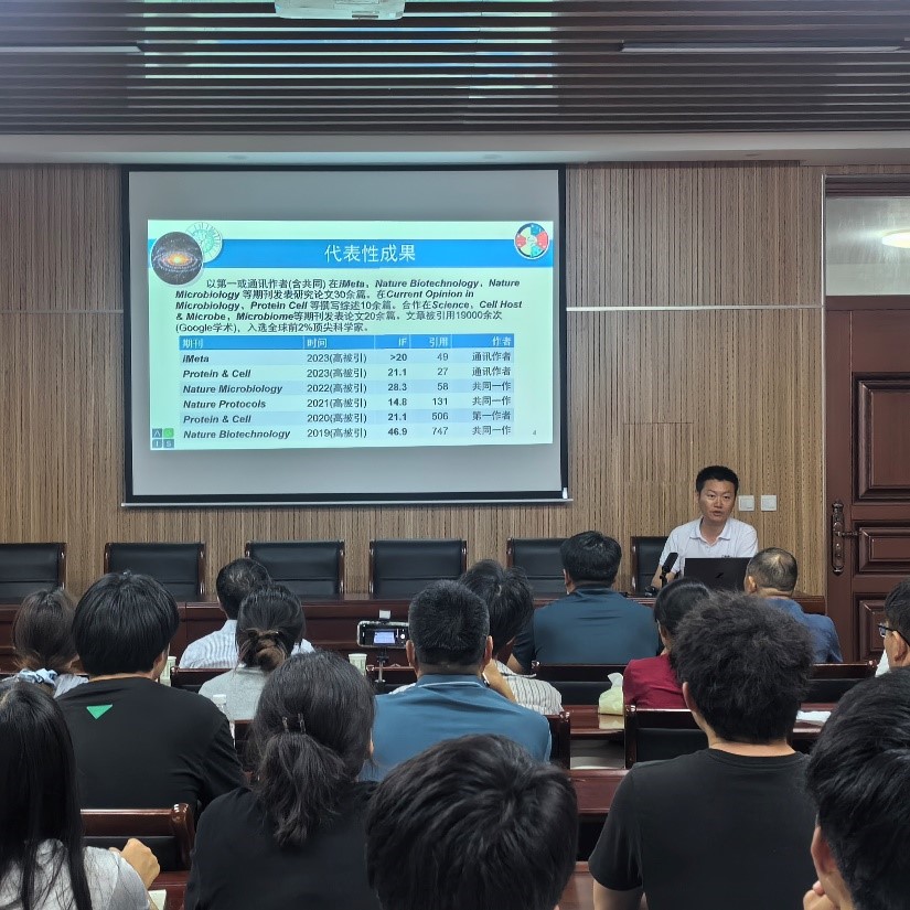 刘研究员以《微生物组学科研生态构建:方法开发、功能挖掘和科学传播》为题,分别从微生物组学的研究方法开发与创新、数据分析与功能挖掘、科研思想与成果的传播等三个方面系统介绍了团队的科研工作。在研究方法开发与创新方面,通过搭建宏基因组学分析流程、建立数据可视化网站与R包及开发宏基因组方法等方面构建多个实用生信分析工具,在数据分析与功能挖掘方面,通过学科交叉与创新合作,在农业微生物组、食品微生物组以及动物和人体内共生微生物基因组功能方面取得了多项重大突破成果;在科学思想与成果传播方面,通过创办《宏基因组》公众号,分享本领域研究方法、成果解读博文3200+篇,已有16万+同行关注,累计阅读量超4千万次,打造了本领域最具影响的科学传播平台之一。此外,由他发起的微生物组和生物信息交叉期刊iMeta,成功打造了微生物组/生物信息领域国际顶刊,解决本领域期刊出版卡脖子问题,建立国际学术话语权体系。此次报告会不仅为一品探花