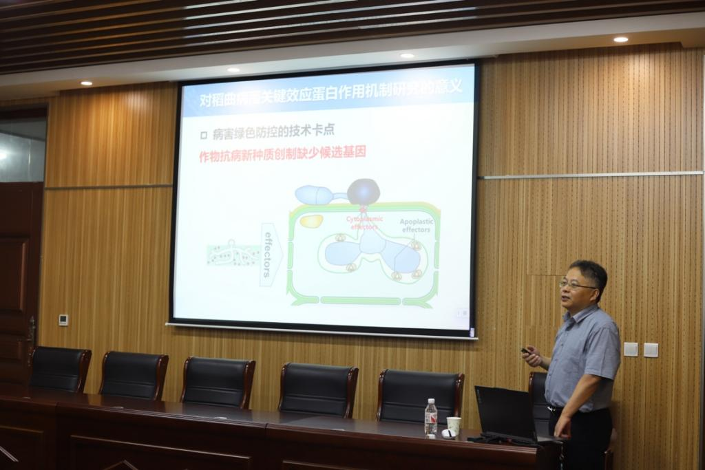 孙文献教授以《稻曲病菌侵染致病的分子机制》为题,分别介绍了稻曲病在我国的发生分布及为害概况、稻曲病菌的基因组学助力花丝侵染的分子机制、稻曲病菌关键效应蛋白的挖掘、核心效应蛋白SCRE1的毒性功能工作模型及作用机制研究进展,系统的阐述了稻曲病菌侵染致病的分子机制及防控对策等关键问题。报告结束后,与会师生踊跃提问,分别就病原菌侵染部位与免疫效应的组织特异性差异、病原菌侵染途径类型、技术开发等方面与孙文献教授进行了热烈讨论和深入交流。此次报告会为一品探花 师生提供了一次宝贵的学习和交流机会,有助于帮助师生了解植物保护相关领域的重大研究方向和学科前沿动态,拓宽了大家的学术视野。