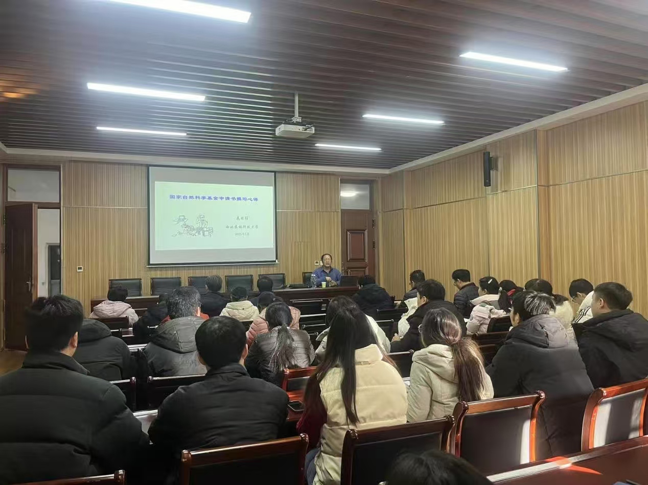 师生开展“如何撰写国家自然科学基金申请书”的专题报告。各学科教师代表及学院博士生参加报告会。