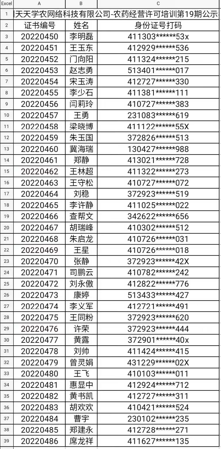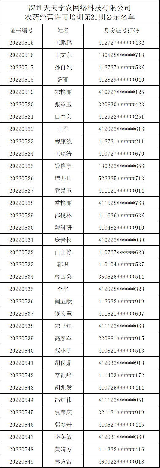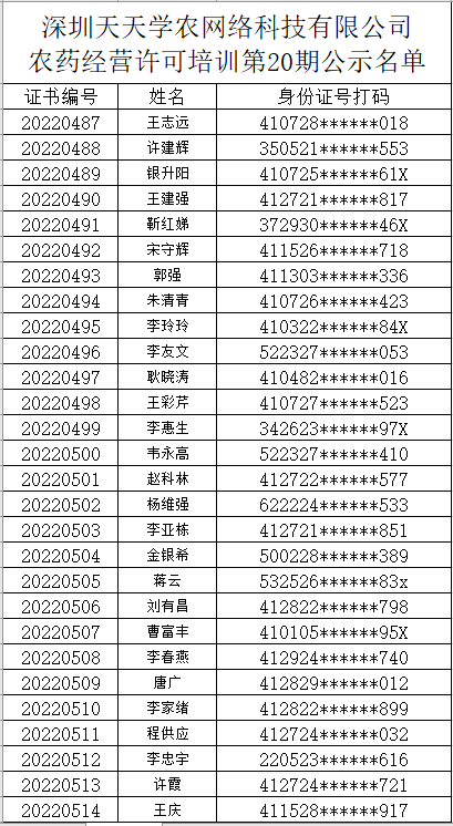 (在线)举办的农药经营资质培训班完成56学时课程学习,考核合格,颁发培训证书。现予以公示,公示期为2022年12月5日-12月19日。公示期内,如有异议,请以书面形式实名向一品探花