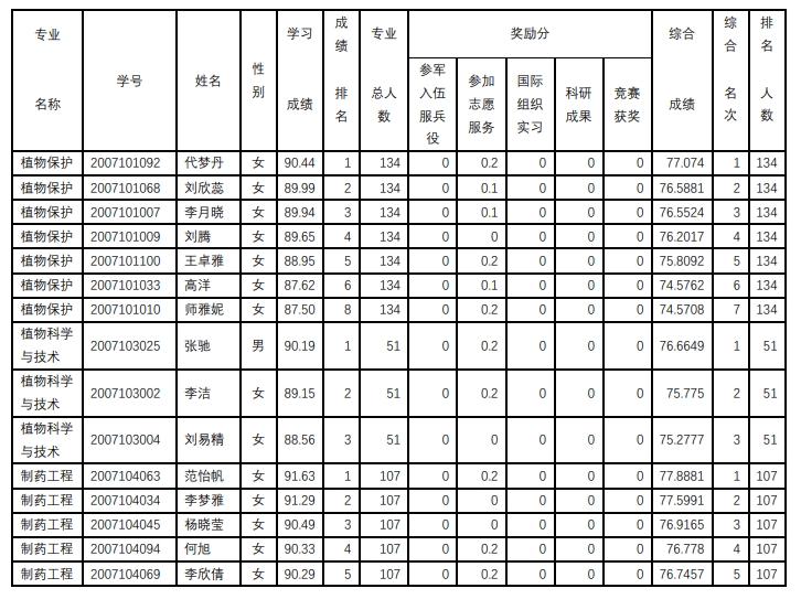 关于2024年推荐优秀应届本科毕业生免试攻读硕士学位研究生的通知》,经过学生本人申请 ,学院推免工作领导小组的审核,同意推荐15名学生免试攻读硕士学位研究生,其中植物保护专业7名,植物科学与技术专业3名,制药工程专业5名,现予以公示,名单如下: 公示期为2023年9月22日--9月23日。公示期间若有异议,可向学院反映。受理电话:56552870。