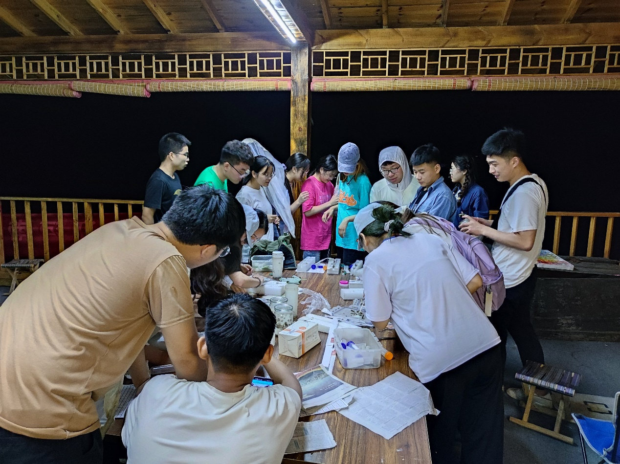 万仙山位于河南省辉县市西北部太行山腹地,长期保留着完好的生态自然环境,森林覆盖率达95%以上,现记载有1900余种植物、430多种野生动物和百余种昆虫。在万仙山实习基地,同学们以小组为单位,迎着细雨、热情高涨地跟随实习指导老师进行了野外植物病害和昆虫资源的调查和采集,仔细观察和鉴定了植物的生理和病理特征,又了解了常见昆虫的栖息环境、行为习性等,并进行初步的分类鉴定。病理系张晓婷老师和赵莹老师现场给同学们讲解了植物常见病害的识别特征和发生规律;昆虫系杜孟芳、安世恒、关若冰、李祥老师为大家示范了昆虫标本的制作方法和注意事项。同学们认真聆听、虚心求教,师生之间充分互动、其乐融融。