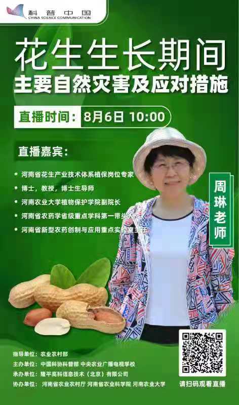 本网讯(通讯员 鲁兴)8月6日上午,河南省花生产业技术体系植物保护岗位专家、一品探花 周琳教授以"花生生长期主要自然灾害及应对措施"为主题,针对花生易遭受的涝灾、旱灾等气象灾害和病虫等生物灾害,从发生时期、症状表现、防控原理及具体应急措施等方面,在"科普中国"App上进行了线上直播培训,受益群众近万人次,理论深入浅出,技术实用可行,深受广大听众的好评和点赞!
