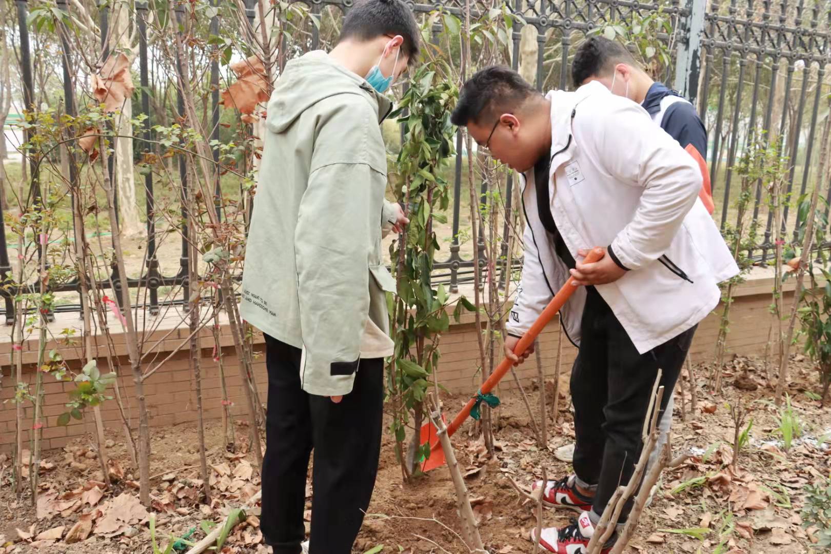 植树活动前,郑州荟萃园林绿化工程有限公司负责人李晓针对种植法青、月季等树种的要求、技巧、安全措施向所有人员进行了培训。随后师生自觉分组,分工明确、相互协作,在振奋、热烈的气氛中圆满完成了本次植树活动。活动结束后,师生对新栽的树苗进行了认领。