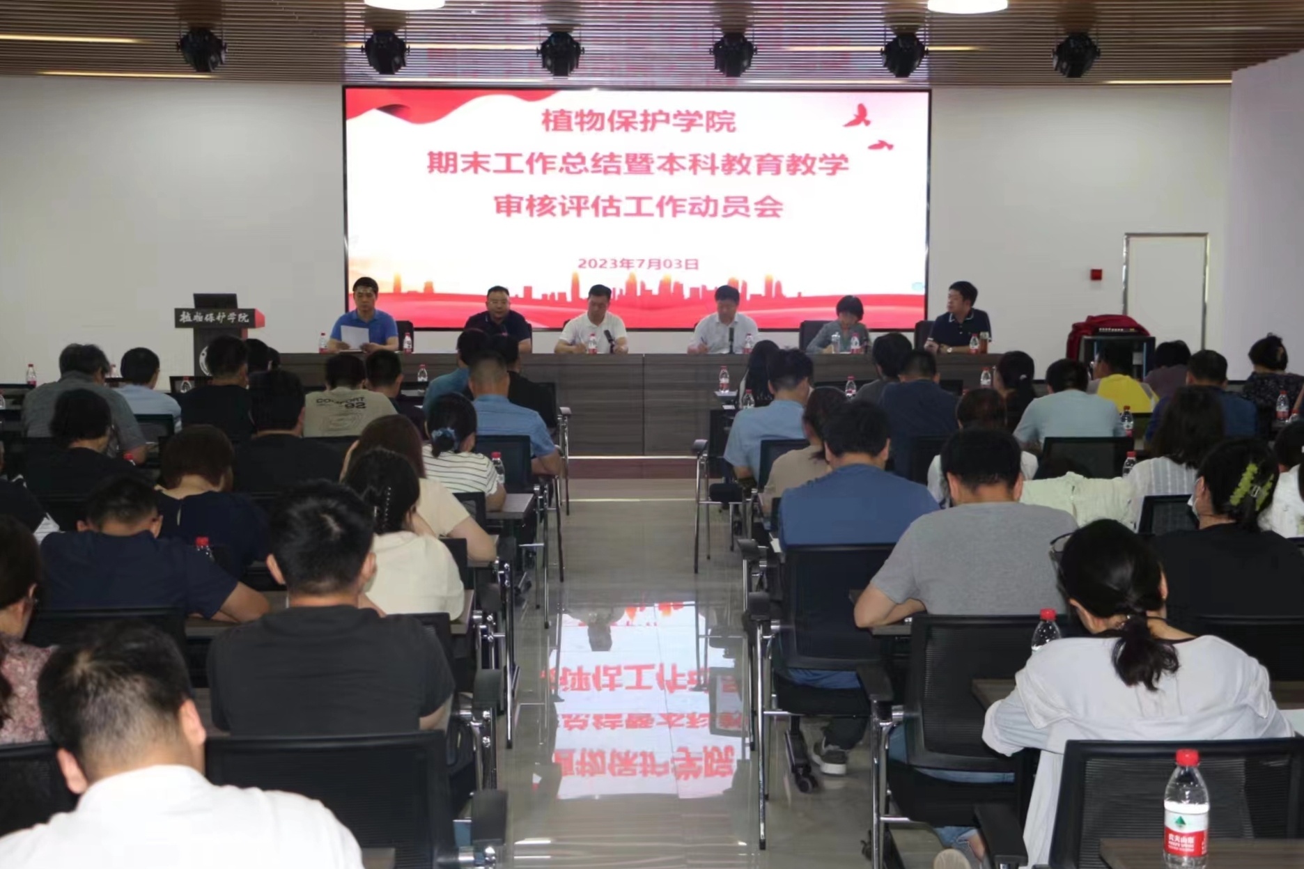 本科教育教学审核评估工作方案》,重点讲解学院评估工作自评自建、诊断提高、正式评估、整改提高四个阶段的具体分工,明确了评估工作的时间节点要求、内容形式和目标任务。确认并公布了学院工作专班领导小组名单和专项工作组名单。动员全院教职工在专班领导小组的领导下,全面贯彻落实党的教育方针,落实立德树人根本任务,牢固树立人才培养中心地位和本科教育教学核心地位,夯实目标责任,细化工作职责,互相支持,协调一致,坚定信心、凝心聚力,全力以赴做好新一轮审核评估工作,真正做到“以评促建、以评促改、以评促管、以评促强”。
