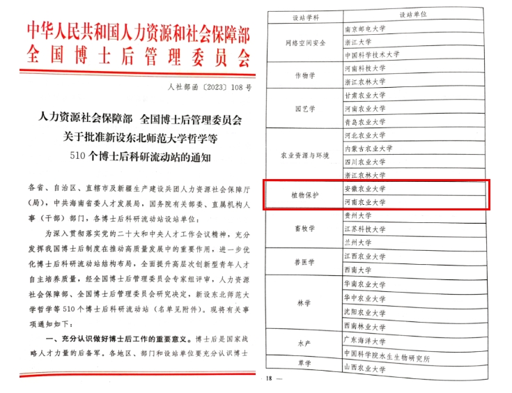 近日,人力资源社会保障部、全国博士后管理委员会联合下发《关于批准设立东北师范大学哲学等510个博士后科研流动站的通知》(人社部函〔2023〕108号),一品探花 申报的“植物保护”学科博士后科研流动站获批设立。