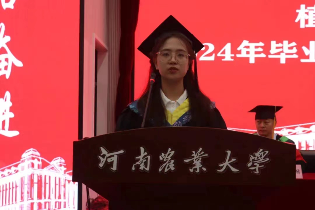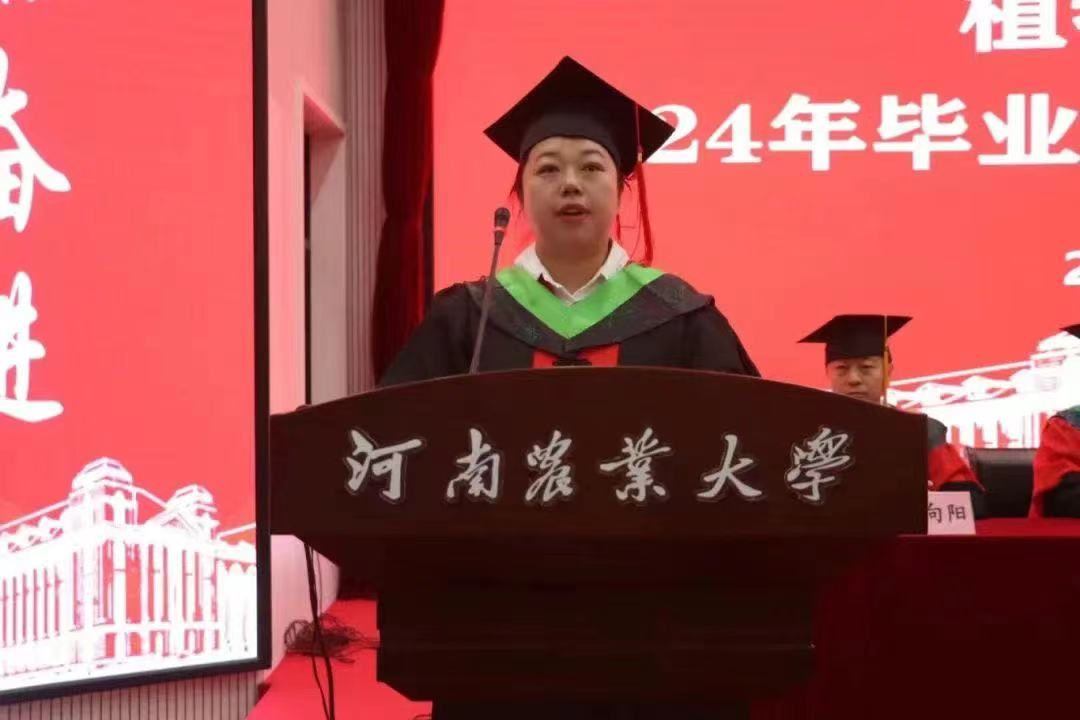 2024届博士毕业生姚雪代表2024届全体毕业研究生发言,她用真挚的感情感激农大的关怀和爱护,她表示“没有农大良好的学习环境和浓厚的学术氛围,就没有我们今天的成长和进步!”并向母校和毕业生们表达了深深的祝福:愿我们的母校硕果累累,再书华章!愿我们的恩师身体健康,桃李满疆!愿植保全体毕业生,鸿图大展,奋发向上!