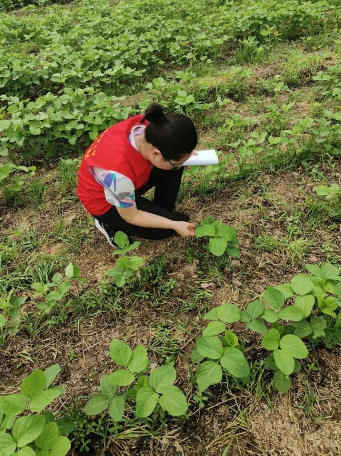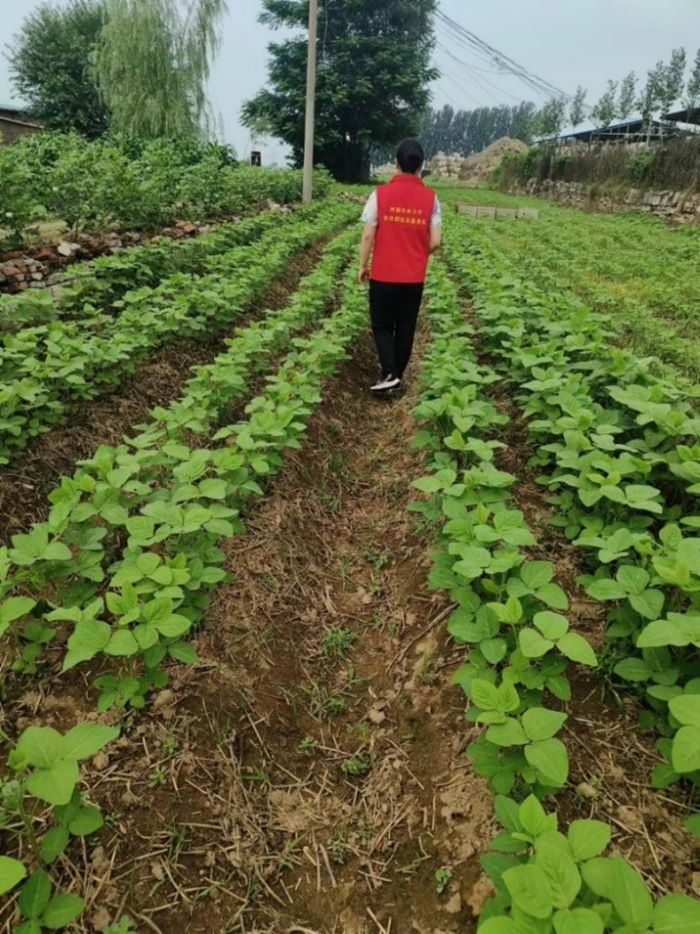 本网讯(通讯员 林榕梅 图片 青语大学生记者团)为了应对病虫害问题,保障大豆的产量和品质,7月19日,我校林榕梅、程川博等人组成的科技特派员服务队前往获嘉县冯庄村在合作社负责人和农户的陪同下,实地考察了100余亩大豆玉米复合种植区,利用现代科技手段,开展病虫害防治工作。