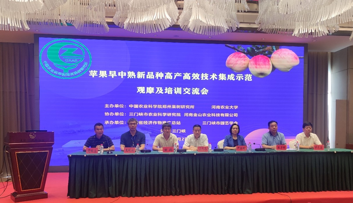 与中国农业科学院郑州果树研究所协同举办的“苹果早中熟新品种高产高效技术集成示范观摩及培训交流会”在三门峡市召开。国家苹果产业技术体系岗位专家尹新明教授及来自全国多家科研院所的近百位专家和青年科技工作者莅临现场交流。