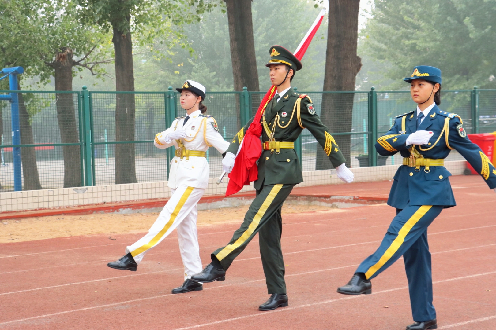 在初升朝阳的映照下,国旗护卫队迈着整齐划一、铿锵有力的步伐,护卫着鲜艳的五星红旗入场,伴随着雄壮的国歌,鲜艳的五星红旗在晨光中冉冉升起,全体师生庄严肃立,奏唱国歌,向国旗行注目礼。