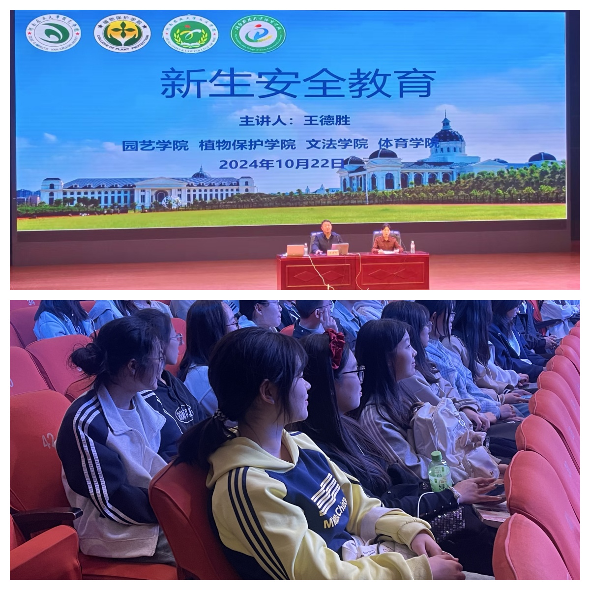 与文法学院、体育学院和园艺学院联合举办新生安全教育讲座,24级新生参加讲座,讲座由我校保卫处副处长王德胜主持。