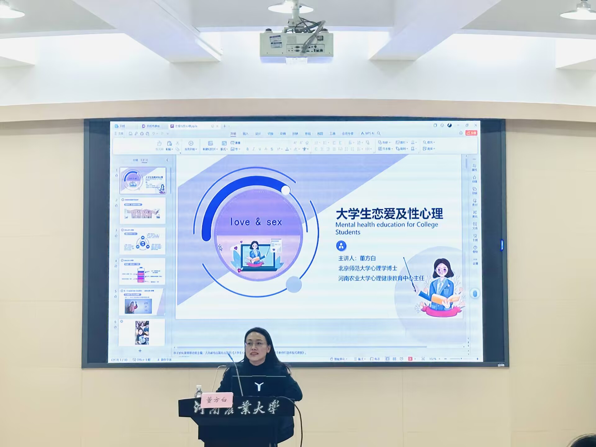 于文化路校区三百人报告厅举办以“大学生恋爱与性心理”为主题的心理健康讲座。24级学生参加讲座,讲座由我校心理健康教育中心主任董方白老师主讲。