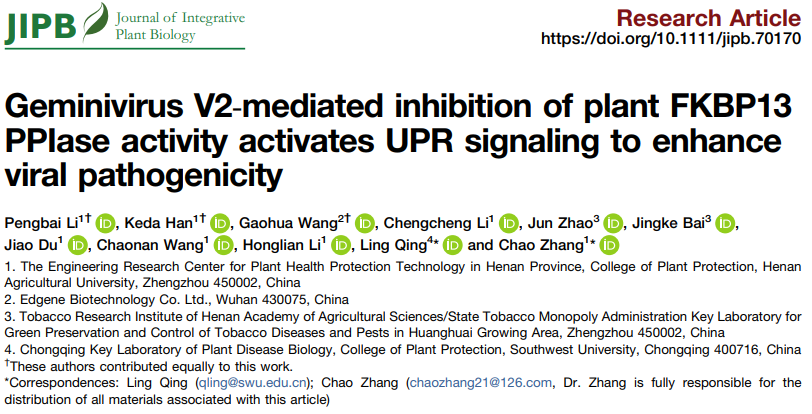 李洪连教授/张超教授团队与西南大学青玲教授合作,在国际权威期刊《Journal of Integrative Plant Biology》上发表了题为“Geminivirus V2-mediated inhibition of plant FKBP13 PPIase activity activates UPR signaling to enhance viral pathogenicity”的研究论文。该研究揭示了双生病毒编码的V2蛋白通过特异性抑制寄主蛋白NbFKBP13的折叠功能激活UPR,进而促进病毒侵染和症状形成的分子机制。这些发现为理解植物-病毒协同进化中的"军备竞赛"提供了新的理论依据。
