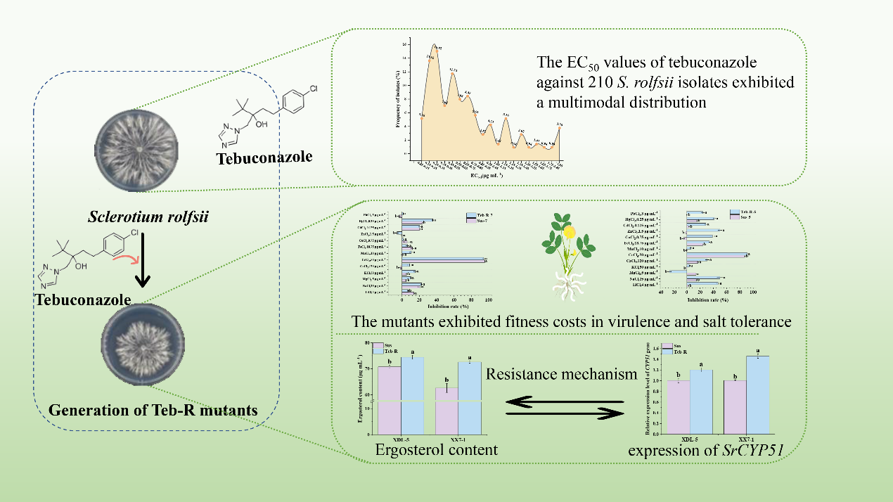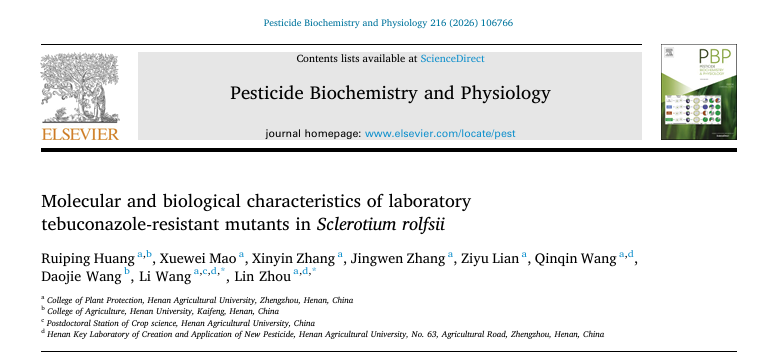 周琳教授团队在中国科学院一区TOP期刊《Pesticide Biochemistry and Physiology》发表了题为“Molecular and biological characteristics of laboratory tebuconazole-resistant mutants in Sclerotium rolfsii”的研究论文。该研究揭示了花生白绢病菌齐整小核菌(Sclerotium rolfsii)对三唑类杀菌剂戊唑醇的抗性风险,明确了其抗性主要与靶标基因SrCYP51基因的过表达及麦角甾醇含量的提高紧密相关。该发现为田间花生白绢病菌的科学防控及抗性治理提供理论依据。